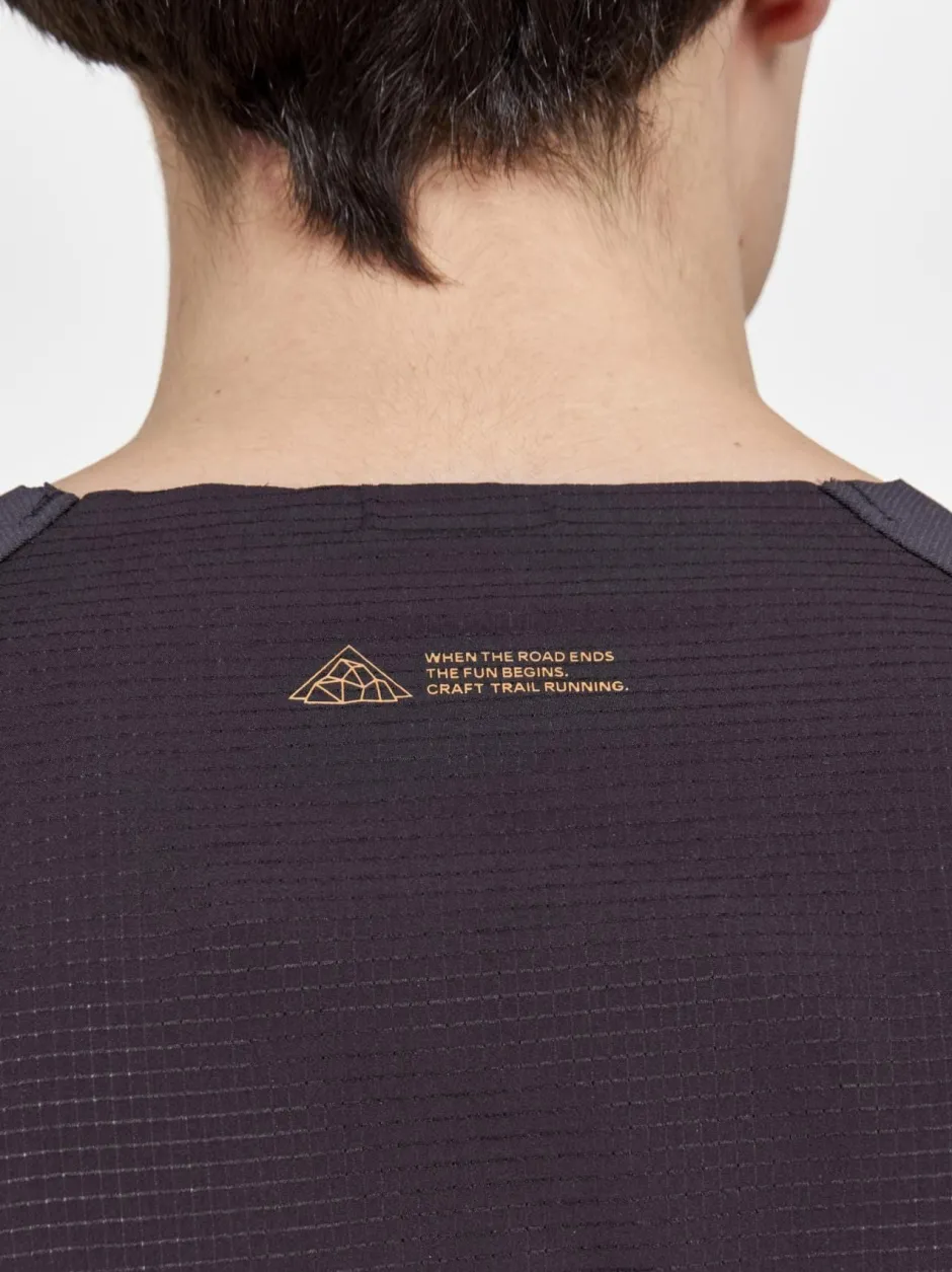 Lightweight, simple, made to move. This trail running tee was designed to keep you flowing. Made with a woven, stretchmesh back, wider sleeves, and special covering along the edges to prevent chafing, this piece keeps running easy.